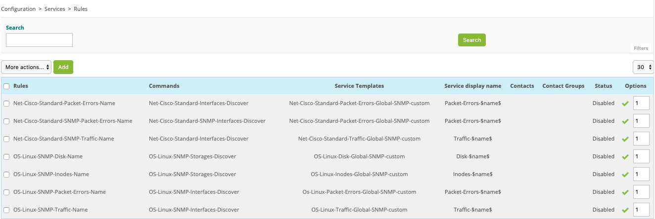 Une règle de découverte permet de créer dynamiquement des services et de les lier à un hôte, en se basant sur les éléments remontés par les sondes. Les services unitaires créés sont attachés à des modèles de services ce qui permet d’utiliser les fonctionnalités de Centreon (héritage, surcharge, etc.)