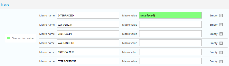 Sur cette image toutes les macros seront créées sur le nouveau service car toutes les cases Empty sont sélectionnées. Pour ne pas créer ces macros, ne pas cocher les cases associées. La macro $_SERVICEINTERFACEID sera créée et contiendra la valeur associée à l’attribut XML $interfaceid de l’élément.