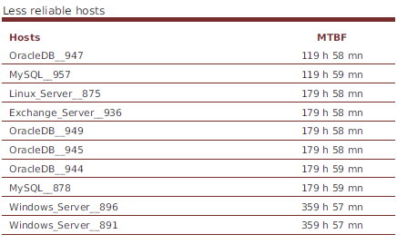 Description: For multiple hostgroups, this table diplays detailed statistics on host maintenanbility, reliabinity and alarms, filtred by host categories