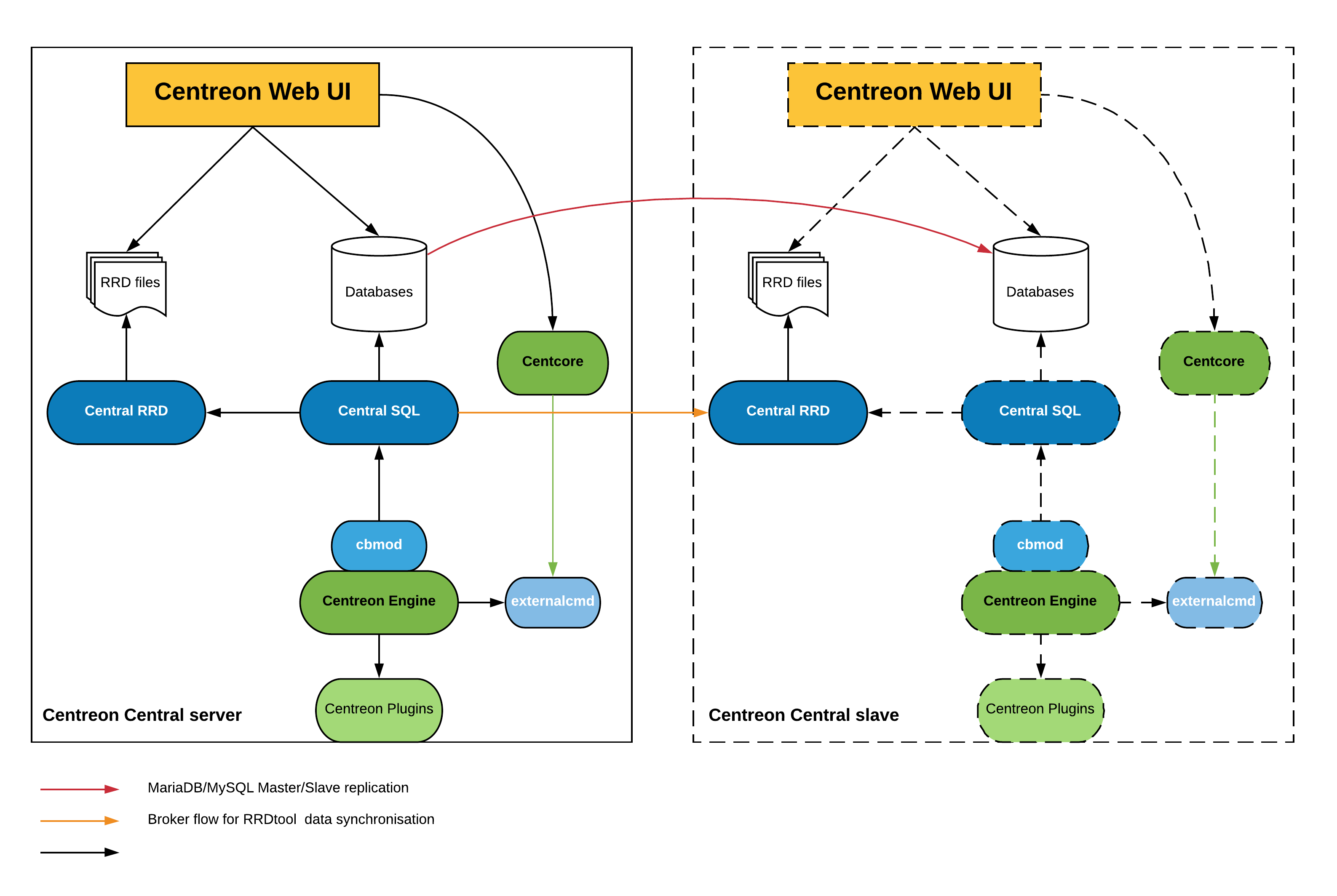 Une réplication MySQL permet de conserver la configuration de Centreon, les informations de supervision ainsi que les données de performances entre les deux serveurs centraux.